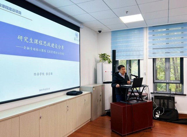 经济学院张宗新教授讲授的《投资理论与实务》是金融专业学位硕士研究生的核心课程之一。作为经济学院金融专业学位硕士点负责人,张教授分享了课程思政和专业教学如何围绕培养具有大国担当和社会责任的金融高端人才的目标、进行有效结合的做法与经验。在教学理念上,他的课程力求让学生对“中国特色资本市场”投资、定价、融资、开放等发展路径有更系统、准确、完整的了解,引导学生深入思考经济、政治、文化、社会、生态五位一体的关系和研究中国资本市场问题,逐渐形成中国资本市场发展服务国家战略、政策及措施的方法论。在课程思政教学设计与实施过程中,他的课程偏重于结合中国新时代发展实践,采取理论结合案例、实务的教学方式,通过编写立足中国本土金融的投资理论与实务教材和案例型教材、注重案例教学、建立投资实务案例库等途径来化解课程教学与思政的难点,并列举了“以科创板为支点,强化科技兴国战略”、“中国现代资本市场如何服务高质量经济增长”、“倡导低碳投资理念,强调‘双碳’目标与基金投资应用”等课程思政的具体案例。