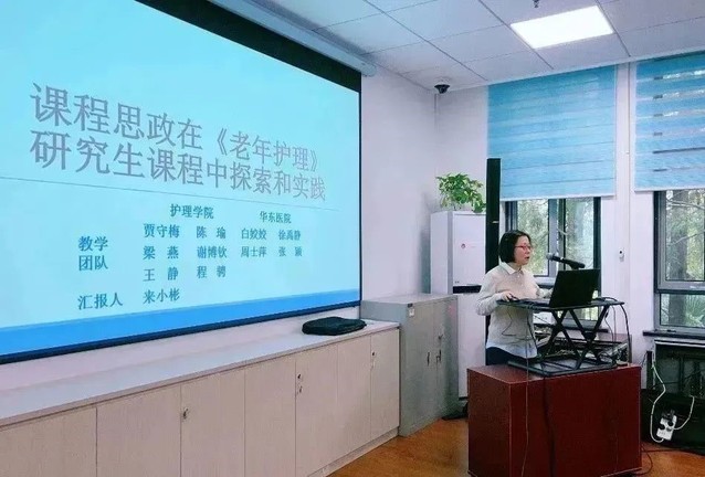 护理学院来小彬副教授参与授课的《老年护理》是一门护理专业学位硕士生的专业选修课,入选上海市课程思政示范课程。她简要介绍了课程基本信息、课改历程和课程思政思路、课程目标和内容、课堂安排,着重展示了通过解读国家卫生健康政策文件、授课教师讲授临床亲身经历、介绍国际前沿研究进展、运用科研方法解决临床护理问题等教学设计与方法,将爱国情怀与使命担当、专业素养、国际视野、科学精神等思政元素融入课程教学的具体案例。在谈及课程思政的教学体会时,她形象地将课程思政教学比喻成煲汤,指出思政元素选材之于教学效果,就好比食材选择之于汤之鲜美,选材要贴合课程教学内容,讲究一要“近”,身边的、真实的案例最能打动人;二要紧跟时代、具有国家层面的宏观视野;三要适时更新、不要老生常谈。