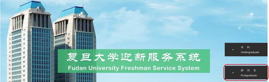 “迎新服务系统”网址为http://freshman.fudan.edu.cn/,进入后选择“研究生”如红色框所示。