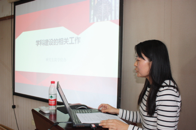 学位评定委员会办公室胡玲琳老师以《学科建设的相关工作》为题,从国际学科排名、国内学科评估、学位授权点合格评估、审核增列学位点及设置交叉学科等方面介绍了学科建设的相关工作。